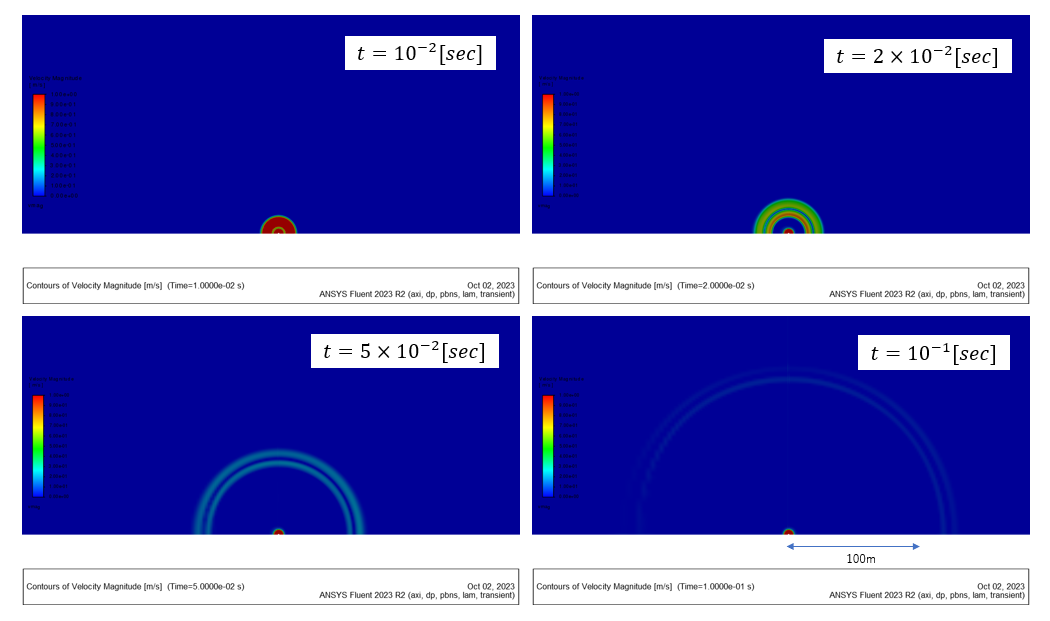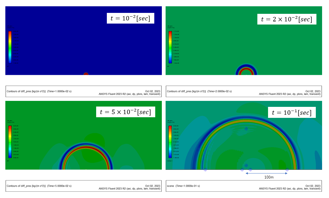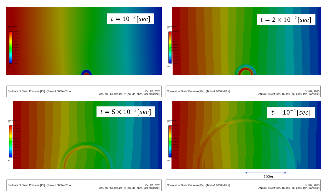 気泡中心から100[m]程度の範囲を対象として圧力のコンターを示す。 圧力レンジを調整して圧力変動が分かるようにしている。