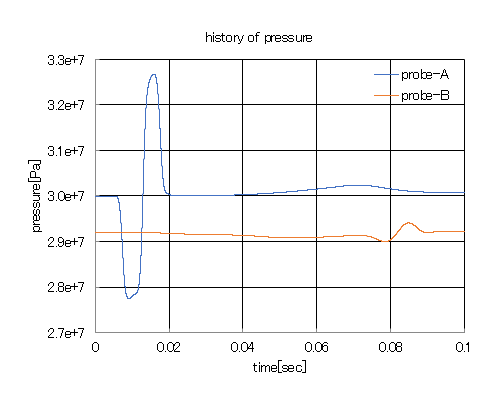 - probe-Aでは、時刻t=0.006~0.02[sec]付近で大きい圧力変動が発生している