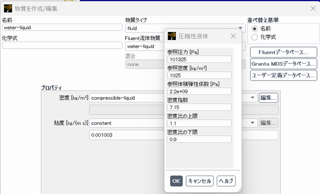 fluentではテイト(Tait)の状態方程式を使って圧縮性液体をモデル化している。