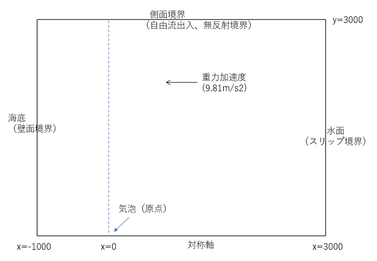 また、気泡から伝わると想定される圧力波が到達した場合には、圧力波がそのまま透過できるように無反射境界とした。