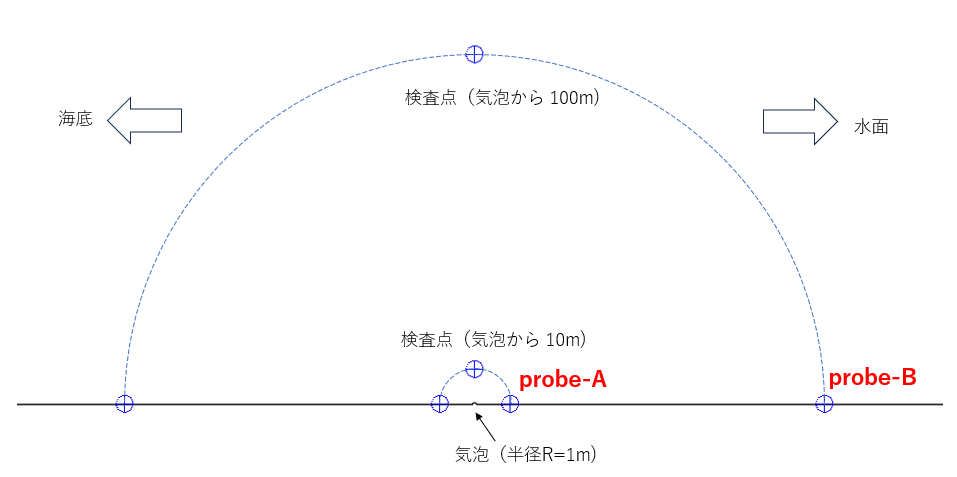 今回の計算では気泡内部のガスの計算は行わない。 また、気泡境界面の移動はないと仮定した(気泡半径1[m])。
