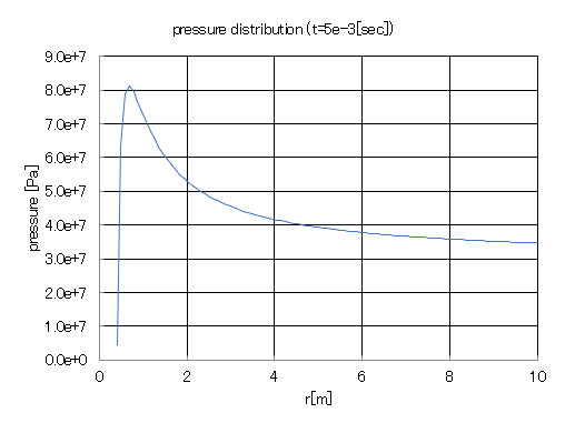 この図は気泡半径$R(=0.402[m])$から$r=10[m]$の範囲の圧力分布を示している。 気泡表面付近において圧力が急激に上昇していることがわかる。