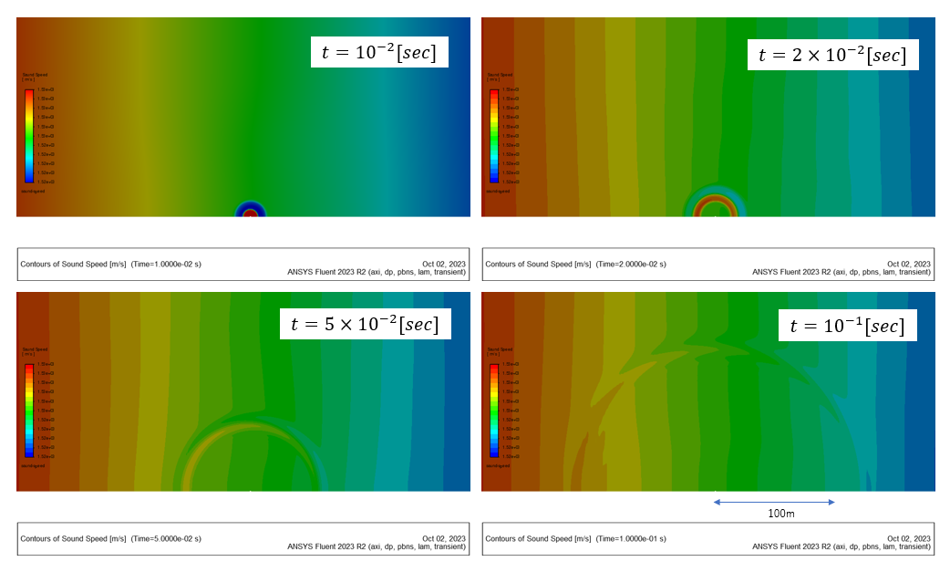 気泡中心から100[m]程度の範囲を対象として音速のコンターを示す。 水中の音速は大体 1500[m/s]程度であり、水深が深い(圧力が大きい)ほど音速が大きくなっている。