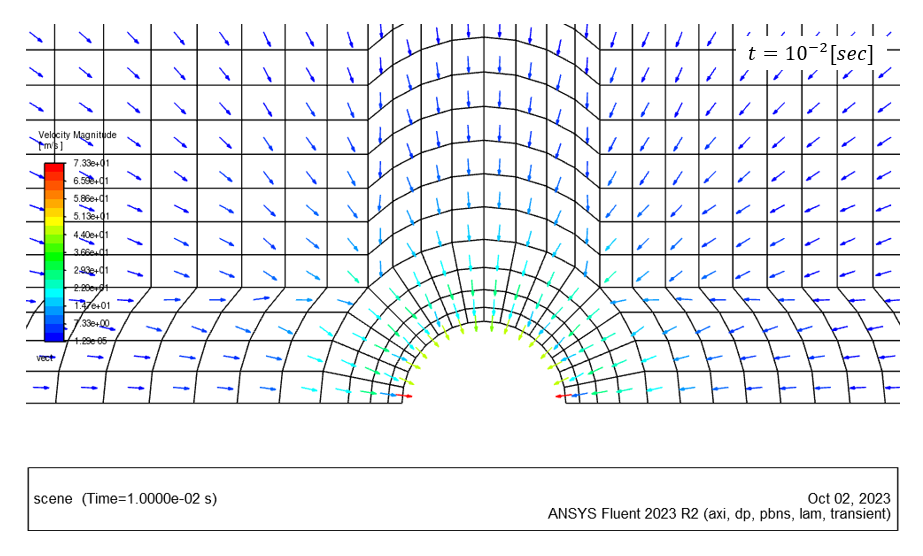 時刻 $t=10^{-2}[sec]$における流速ベクトル図を示す。 矢印長さが同一になるように表示している。