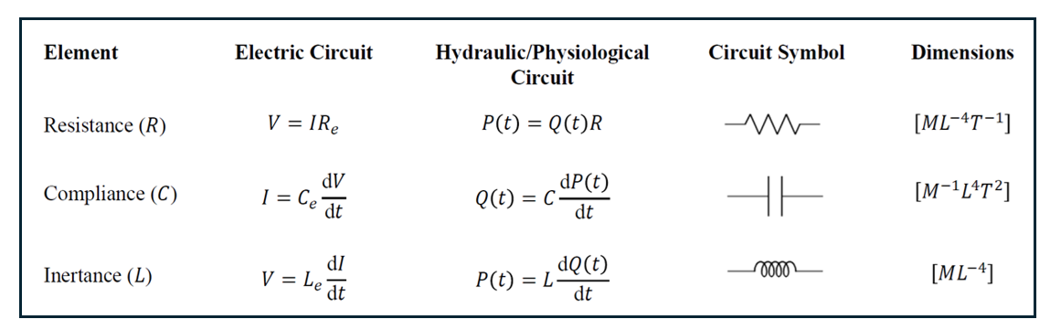 windkesselモデルは電流回路とのアナロジーで表現することができる。以下に対応関係を 示す。