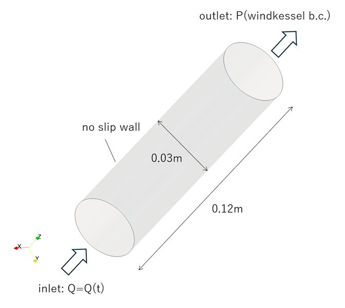 直径3cm、長さ12cmの円柱を考える。円柱下端において流入速度を指定した。 円柱上端はwindkessel境界を設定した。