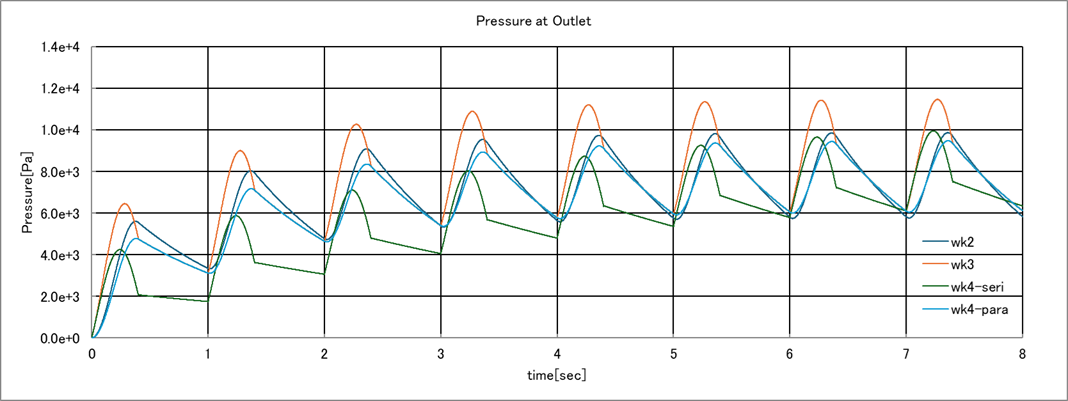 次にwindkesselモデルの全ケース(wk2,wk3,wk4-seri,wk4-para)の流量、 および出口圧力の経時変化を示す。 使用するwindkesselモデルにより圧力の変動特性が大きく異なっていることがわかる。