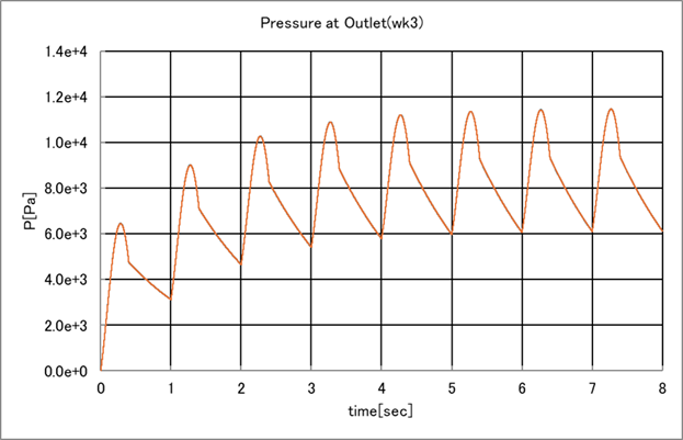 出口境界面における圧力の経時変化を調べると下図のようになった。 8周期程度でほぼ定常状態に漸近していることがわかる。