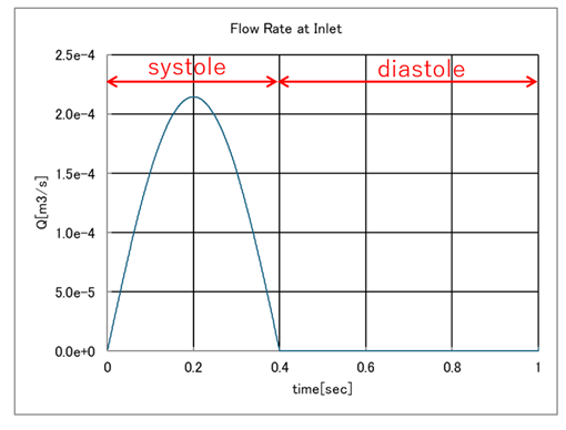 流速強度は心拍周期1[sec]で変動する。 心臓収縮期(0.4[sec])には正弦関数で流量が増減し、 心臓拡張期(0.6[sec])には流量ゼロとした。 またinlet境界面の流速分布形状は放物面を仮定した。
