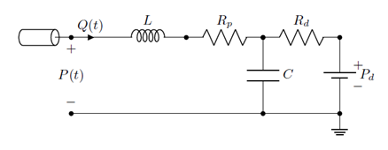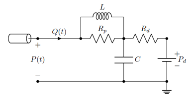 $$ \begin{align} Q(t) +L\left( \frac{R_p+R_d}{R_p R_d} \right) \frac{d Q(t)}{dt} + CL \frac{d^2 Q(t)}{dt^2} = \frac{CL}{R_p} \frac{d^2 P(t)}{dt^2} +\left( C + \frac{L}{R_p R_d} \right) \frac{d P(t)}{dt} +\frac{ P(t)-P_d}{R_d} \end{align} $$