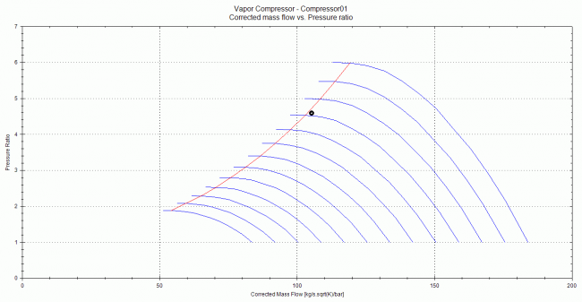 圧縮機の性能曲線(圧力比‐修正流量)で運転時の動作点を確認することができます(図 3)。上図の赤線はサージライン、丸印は凝縮器側の水温が高温の場合(図 1で凝縮器側がWarm dayの場合)の定常運転位置です。