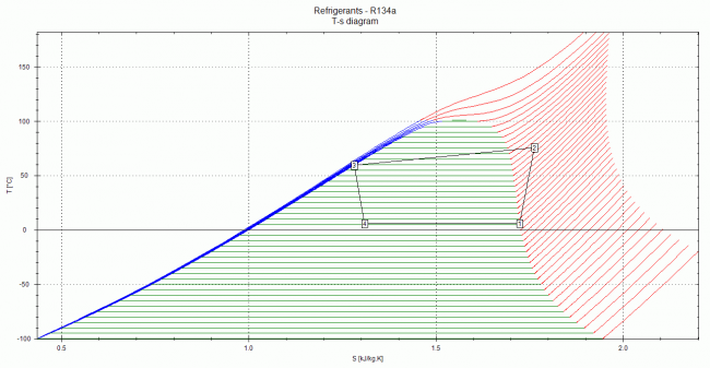 T-s線図(温度‐比エントロピー)、h-s線図(比エンタルピー‐比エントロピー;モリエ線図)などにより、冷凍機の運転状態を確認することができます。