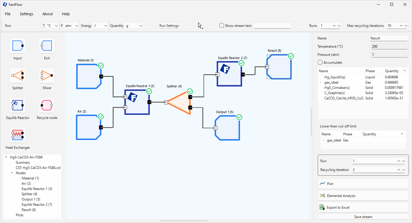 このプロセスで生成する水銀の量は、平衡計算を 2 回実施することで予測することができます。このような複数回の平衡計算を簡単に行えるアドオンが 2 つ(FactFlow, FactProSiim)追加されました。両者のできることは似ているのですが、使い勝手は異なります。