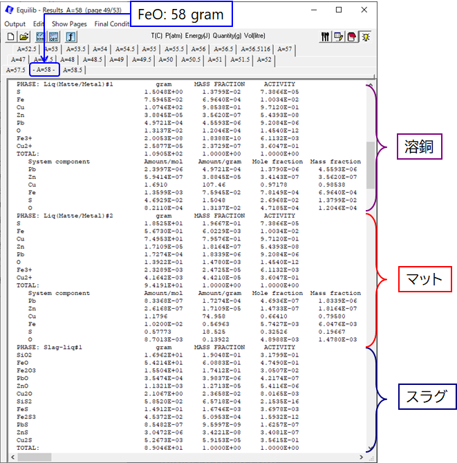 銅-スラグ-マット系の 1250 ℃ での平衡状態を計算する( 銅製錬関連 )。