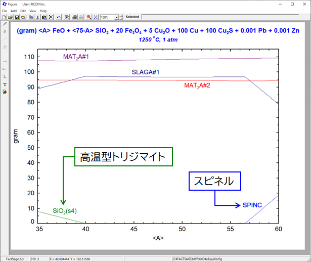 FeO と SiO2 の比率を変化させたときの固体(高温型トリジマイトとスピネル)の生成量が予測できる。