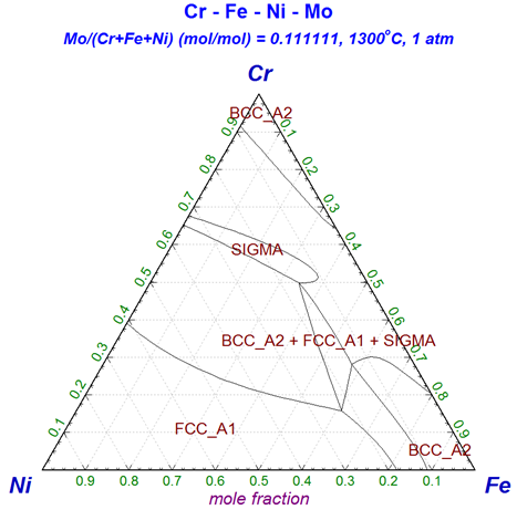 2 元系、3 元系の合金状態図だけでなく、4 元系以上の状態図も作成できます。4 元系を三角形の状態図に示すときは、1 成分を固定します。図は Mo が 10 mol% 含まれている場合の平衡状態図です。(熱力学データベース: SGTE 2017)
