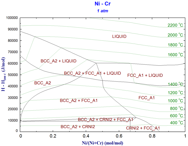 縦軸は系に与える熱量です。系に熱を与えたとき、系がどのような組成や温度になるかを状態図で調べることができます。(熱力学データベース: SGTE 2017)