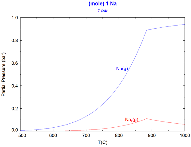 純物質の蒸気圧、混合気体の分圧を計算できます。ナトリウムの蒸気は Na と Na2 の混合気体です。下図に分圧の温度依存性を示します。沸点(計算では 883.52 ℃)以上では、Na2 の分圧は温度が上昇するに従い小さくなります。(熱力学データベース: FactPS)