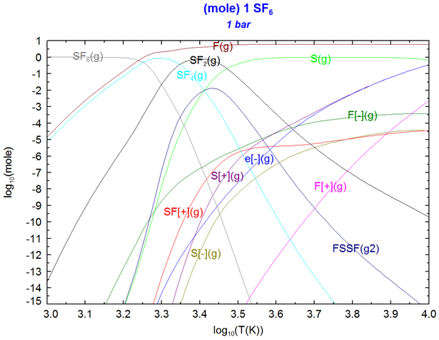 プラズマの解析も可能です。六フッ化硫黄(SF6)の高温での平衡組成を調べると、イオン(F[-]、S[+])や電子(e[-])が現れます。この系では 36 の化学種を考慮して計算をしていますが、下図は主要な化学種のみを表示しています。(熱力学データベース: FactPS)