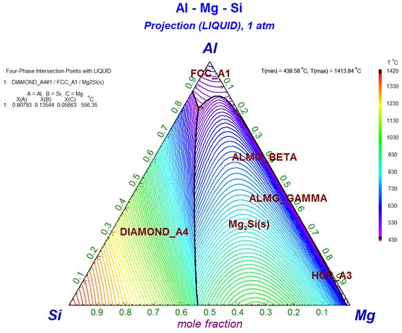 合金の液相面投影図も簡単な設定で計算することができます。融点が最も低い組成がわかります。(熱力学データベース: SGTE 2017)