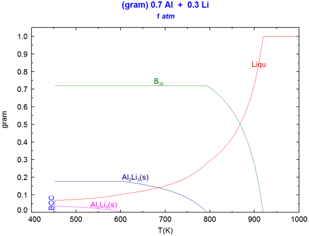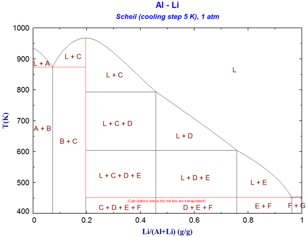 すぐ上の図では、ある一つの組成(Li の質量分率が 0.3)における溶融合金を冷却したときの析出物を予測しています。下図は組成を変化させたときに析出する物質を表しています(Scheil-Gulliver Constituent Diagram or Pelton Diagram)。L = Liqu, C = B32, D = Al2Li3(s), E + F = Al4Li9(s) + BCC の意味です。(熱力学データベース: FTlite)